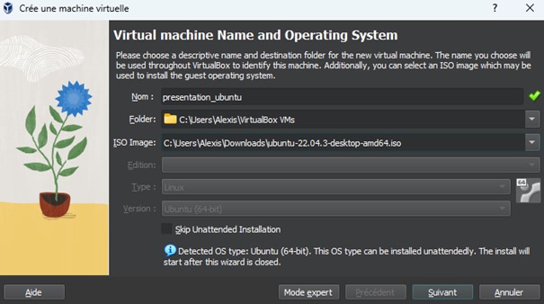 Donne un nom à ta VM, dans le champ 'Nom' tu peux mettre « Ubuntu » pour repérer ta VM facilement. (Évite de mettre des _ ou encore des accents.).