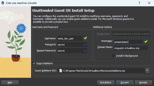 Une fois que tu as remplis ces deux champs tu peux cliquer sur Guest Additions juste en dessous. Pour la partie ‘Additional Options’ si tu as tout bien rempli dans la première partie tu n’as rien à faire et tu devrais avoir un mis à côté du champs Hostname.