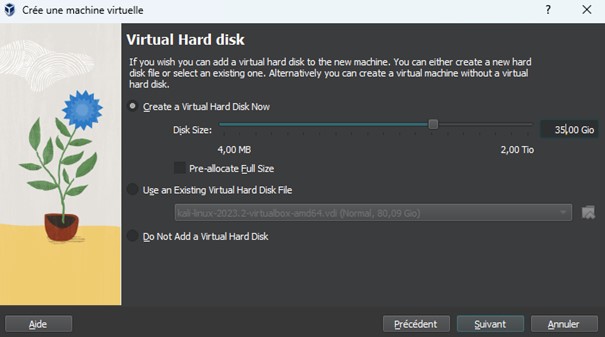 Choisis la taille du disque dur que tu souhaites allouer à ta machine virtuelle. On vous conseille un disque de 35Go pour être tranquille.