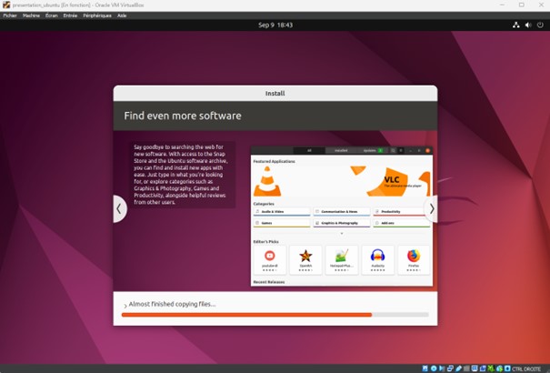 Lorsque le chargement sera fini ta VM va se mettre à redémarrer toute seule et tu arriveras sur l’écran de chargement d’Ubuntu. Il faut encore une fois attendre un peu😴.